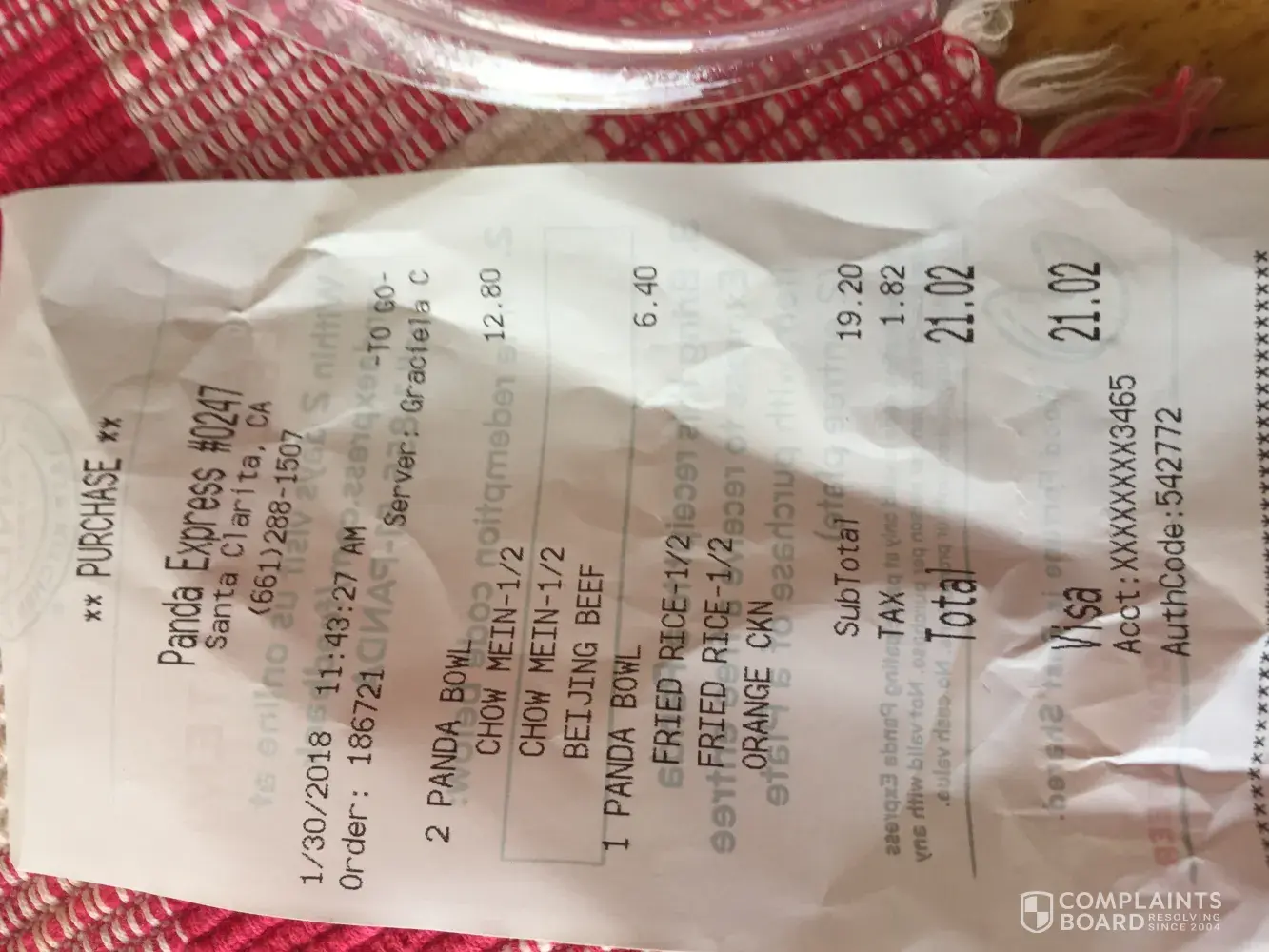 Attaching copy of receipt and a photo of the orange sauce on the lid of the Beijing beef.
