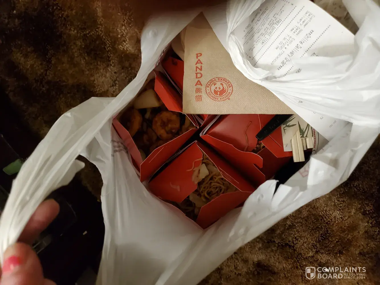 Our order was delivered with 4 of the food containers wide open in the bag. Ordered: 2 chow main, 1 large firecracker shrimp, 1 large orange chicken, 1 large veggie roll and a small brocolli beef. Got: 2 chow main, 2 large shrimp (1 box the shrimp was gross GOOEY like snot ), 1 small brocolli beef and four TINY and SOGGY egg rolls. ALL COLD. Also...I found a HAIR in the shrimp! YUCK!