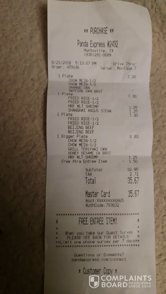 I truly love Panda Express but this is the third time now that my familys order has been messed up and this time 3 of us got nothing that was ordered ...it had to been somebody else's order, completely! I live 30 minutes away so round trip it's over an hour. I've called the store and it's been busy constantly. It was restaurant# 2492 in Huntsville texas 77340. Drive thru- time was 5:13 pm today. Order # 479146 employee-Monique, cost $35.67