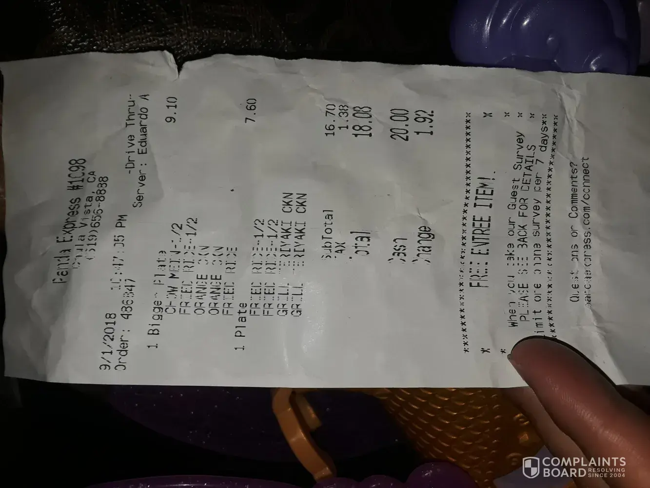I came to Panda on Kietzke On in Reno, store #0776 for lunch two days ago and did the survey on the back of the receipt. It gave me a code to use for a free entree with purchase of a 2 item entree plate. I came back to the same store tonight for dinner with a friend. I ordered the 1-item bowl and she ordered the 2-item plate and 2 drinks. We still had to pay $17.92. How is that a free entree? My bowl should've been free according to the coupon/code displayed on the back of the receipt. I asked the cashier and she got upset and frustrated because she said she took it off already but clearly she didn't. The manager came over and she too did not seem to be understanding what My issue was. My entree was $6.90, my friends was $7.30. That should've taken off the $6.90 but all she took off was $2.75. I will not be returning to Panda after this experience since you're not going to honor the coupon on the back of the receipt as its stated.