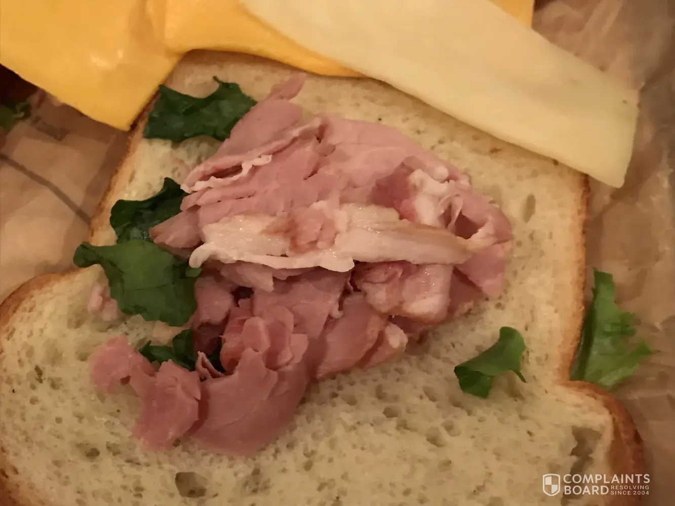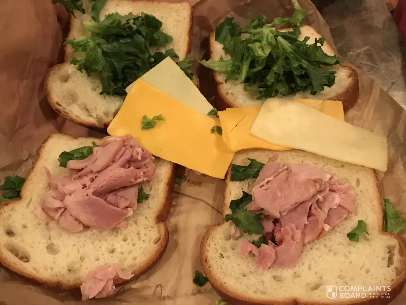 The sandwich was a joke. 2 white bread sandwiches with 1 piece of ham and 1/2 a slice of cheese on each with some lettuce. I asked for American cheese instead of Swiss and was up charged $1 and got 1 slice 1/2 a slice on each sandwich. The 1 slice of ham on each sandwich was mostly fat too. Did not eat it and I am very very unhappy. Cost me $8.79+tax my...