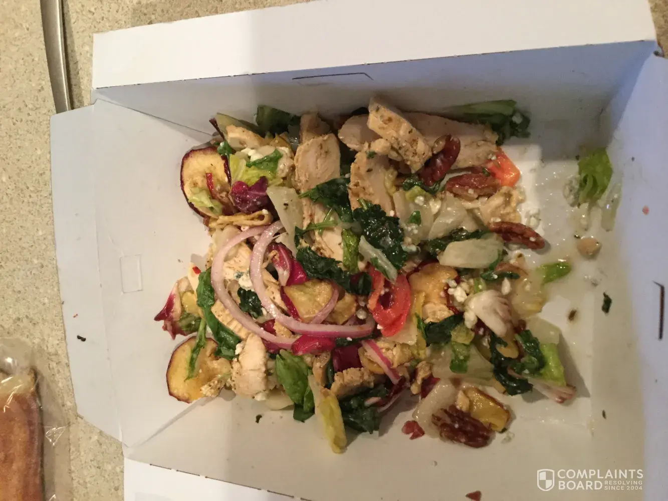 Last evening I ordered a fugi apple chicken salad to go and when I ate the salad a bit later, they had already placed the dressing on it leaving the salad extremely soggy. There was standing water in the bottom of the paper container. The five pieces of lettuce were terrible and unedible and the apple crisps were very wet unappealing. It I was a full size salad that didn't even fill a quarter of the container. The baguette was even over cooked and hard and dry. I am not a person who has ever complained, but I experience something wrong with what I order every time I eat at Panera at the Lengends Kansas City location. Very disappointing and likely will not return even though I live right around the corner.