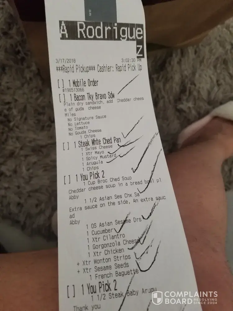 Mobile order [protected]. Paid $58.33 Online order. Cafe order #921805. We pick it up in the drive-through. Ordered bacon Turkey Bravo sandwich customize they got a wrong. I ordered salad no tomatoes they got it wrong. I Iask for silverware no silver included. which is upsetting because we order 2 soups with no spoons. I order two bread bowls only got one. I paid $58.33 and only got 3 napkins. I ordered 10 items with 3 Napkins. Very disappointed. When I call the manager has solution was to me to drive back 6 miles