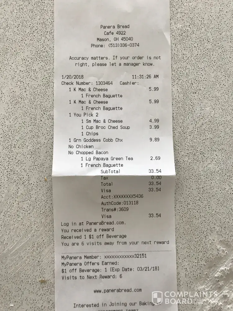 I submitted an online order for Panera Bread located at 147 West Port Plaza Dr., Maryland Heights, MO 63146 at 10am on 01/12/2018. It was scheduled for pick up at 12:05pm during my lunch break as I work right up the street. The order number is #[protected]. The order was for a bowl of black bean soup with French baguette and a regular chai tea latte. I ordered the tea as I am only supposed to have limited amounts of coffee each day. The drink is absolutely awful. It is not a tea, it is most definitely coffee. It is very sweet. It is possible that someone mixed up the order and it was made incorrectly but it is very disappointing when you can't drink something that you paid $3.59 for.