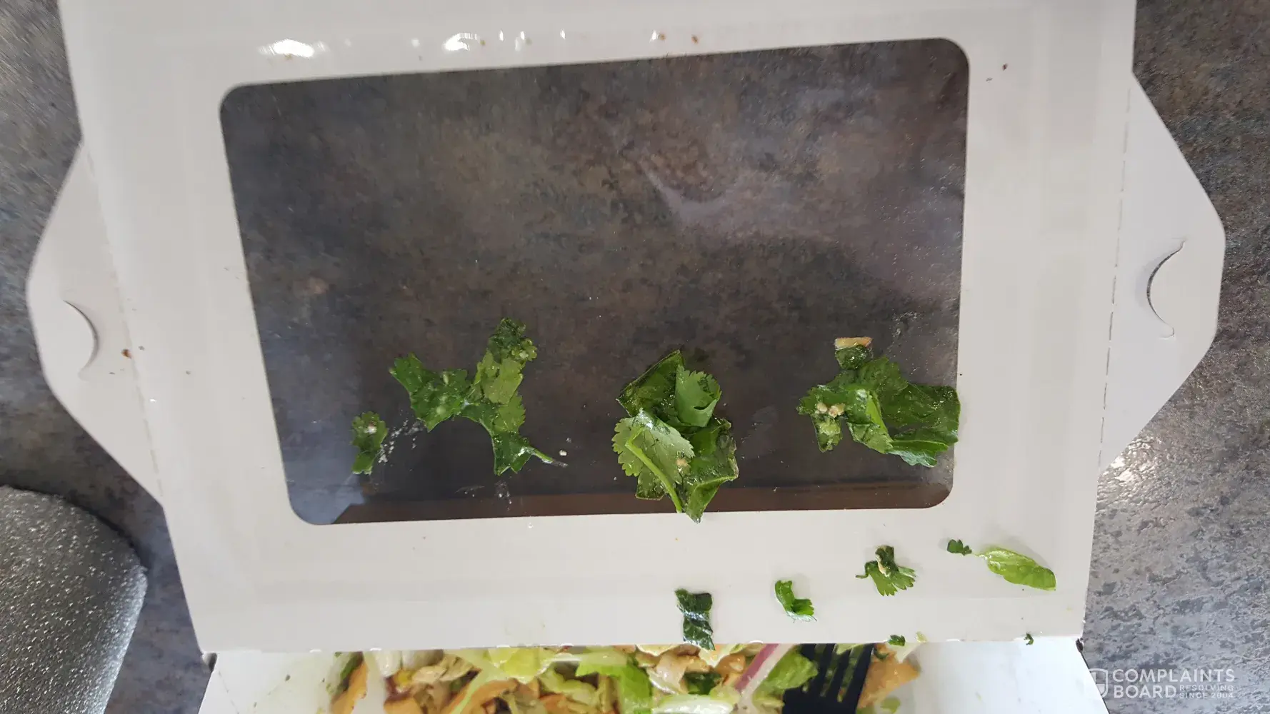 I ordered a whole Asian Sesame Salad with Chicken and added Avacado & pecans and specified NO cilantro. As you can see with the picture below I pulled all the big pieces I could find, but couldn't eat anymore due to the fact it had a lot of little pieces left, and I'm one of the rare people that taste soap when eating cilantro, and could not take it anymore.