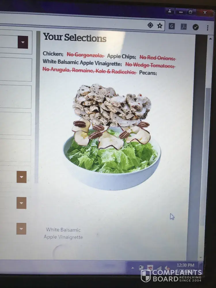 I placed an order for rapid ordering and my online order is [protected] and the location is Wyomissing PA. I was ordering for everyone at work and I placed an order for Chicken Fuji Apple Salad. I ordered it with no Tomato, Red Onion and Arugula, Romaine, Kale and Rad. When you order online... it takes away the stuff that you don't want. With that being said... It still showed greens in the bowl . So when I received my order... I had nothing but the toppings for the salad. I provided my phone number and I would of thought that someone would have called to see if that was correct and I would have imformed them NO it is not. I have attached pictures of what the website said that I would get in my salad and what I actually got. I would never pay for just the topping for a salad. I called the Wyomissing branch and the person that I spoke to, really couldn't care if I was happy and told me that it was pretty much my fault because I took away the greens. I pushed 5 to speak to a manager. Like I said... I have attached the pictures of what was showing on the website and what I actually got. Needless to say... I didn't have lunch.