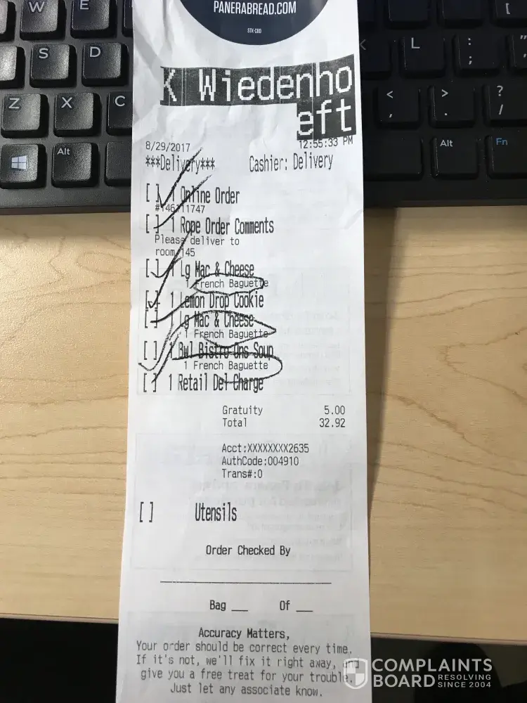 Panera Bread wrong food delivered/food unacceptable