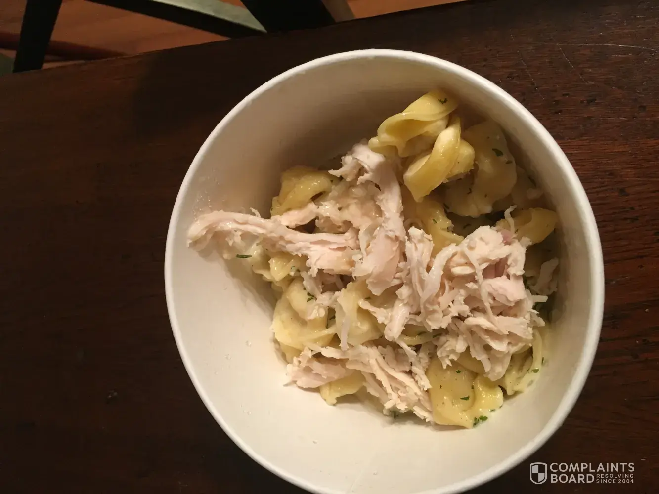 Upon arriving home to eat dinner I found that the tortilleni alfredo that I paid $8.99 was dried out. Some pieces so hard that they were completely inedible! To top it off, there was shredded chicken that I had to pull off. This is not the first unpleasant experience I've had with Panera but it is, in fact, one that will sway my choice when it comes time to select an eatery in the future. The quality of the food is not up to par considering the cost of eating at your establishment. I look forward to receiving a response regarding this less than satisfactory experience.