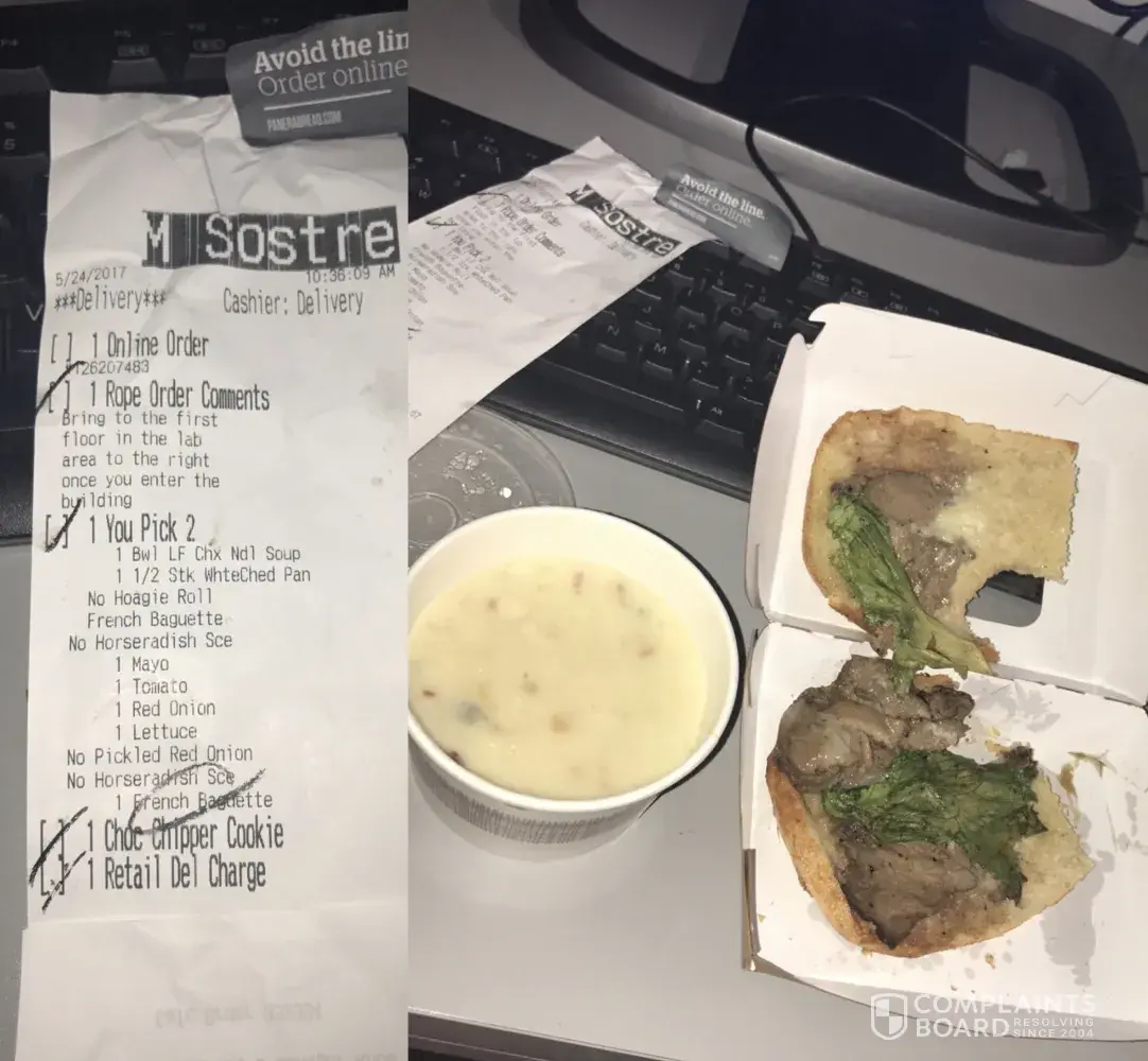 I ordered a chicken noodle soup and a 1/2 steak &a white cheddar panini which I modified adding lettuce, tomato, mayo and red onion along with a chocolate chip cookie. Once I received the order I immediately took a bite of the sandwich and noticed it was dry and very plain. Opened it up and I have a steak and cheese sandwich with a soggy piece of lettuce and a bowl of a creamy white substance. I politely called Panera and explained the situation and was transferred to a manager who claimed he made my sandwich personally and said he put the items in question on there. He insinuated that I was being false, and then placed me on hold for another manager to pick up and say if I want a refund they have to come pick up the food for verification which I explained I was ok with. Very poor customer service, I get that it's a busy location, I did have multiple modifications and I ordered during a lunch rush, but I paid 19$ for my order and I want it how I ordered it. Then to be accused of lying about some onions and a tomato was just the ultimate slap in the face. Meanwhile my coworkers are enjoying Donatos pizza and I'm eating a chocolate chip cookie and a dry baguette! Kevin and John need a refresher course on customs service!