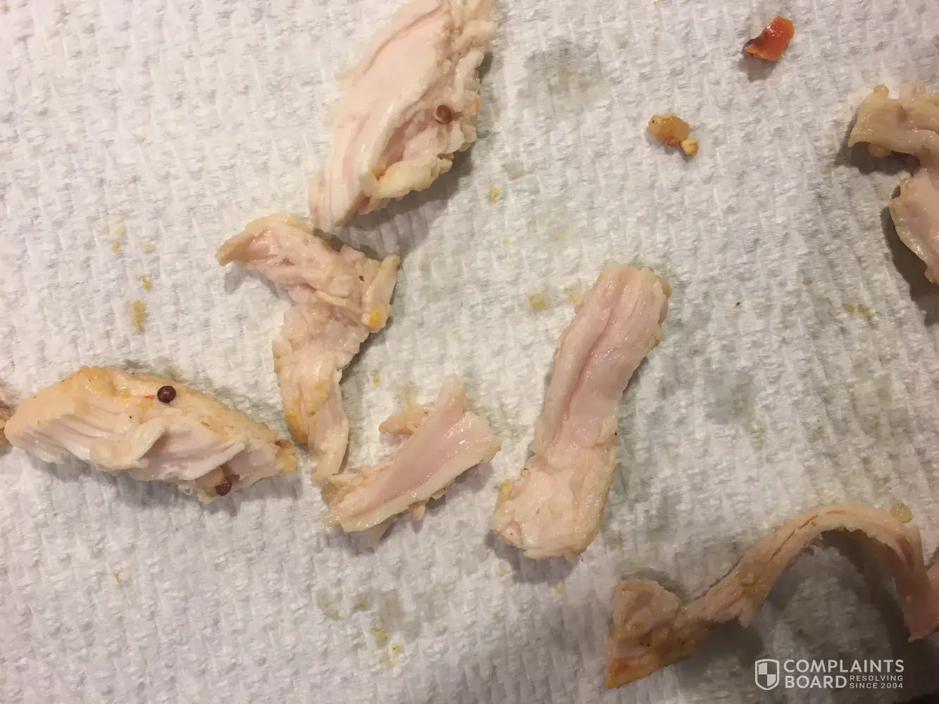 I got a chicken sandwich, frontega pocaccia, at the sandusky, ohio, panera bread, on 4/25/17 for $5.99. I am still looking for the chicken. I am including pictures. I couldn't believe it. If I pay $5.99 for 1/2 sandwich, i'd at least like a piece of chicken or something similar. When it looks like to me is that someone chewed up what little chicken there was and spit it on the sandwich. It included cheese, tomato and I had them hold the chipotle mayo & red onion. Maybe if someone includes the red onion on it, they don't notice that the chicken has crossed the road and got away. I would say also that it took a very long time to get the little, iitty, bitty chicken but that the sales person/cashier was very apologetic for that and apologized immensely about it. Maybe he took a look at the sandwich and was apologizing that someone had chewed up my chicken. I won't be returning to that panera and am asking for my $5.99 be returned.