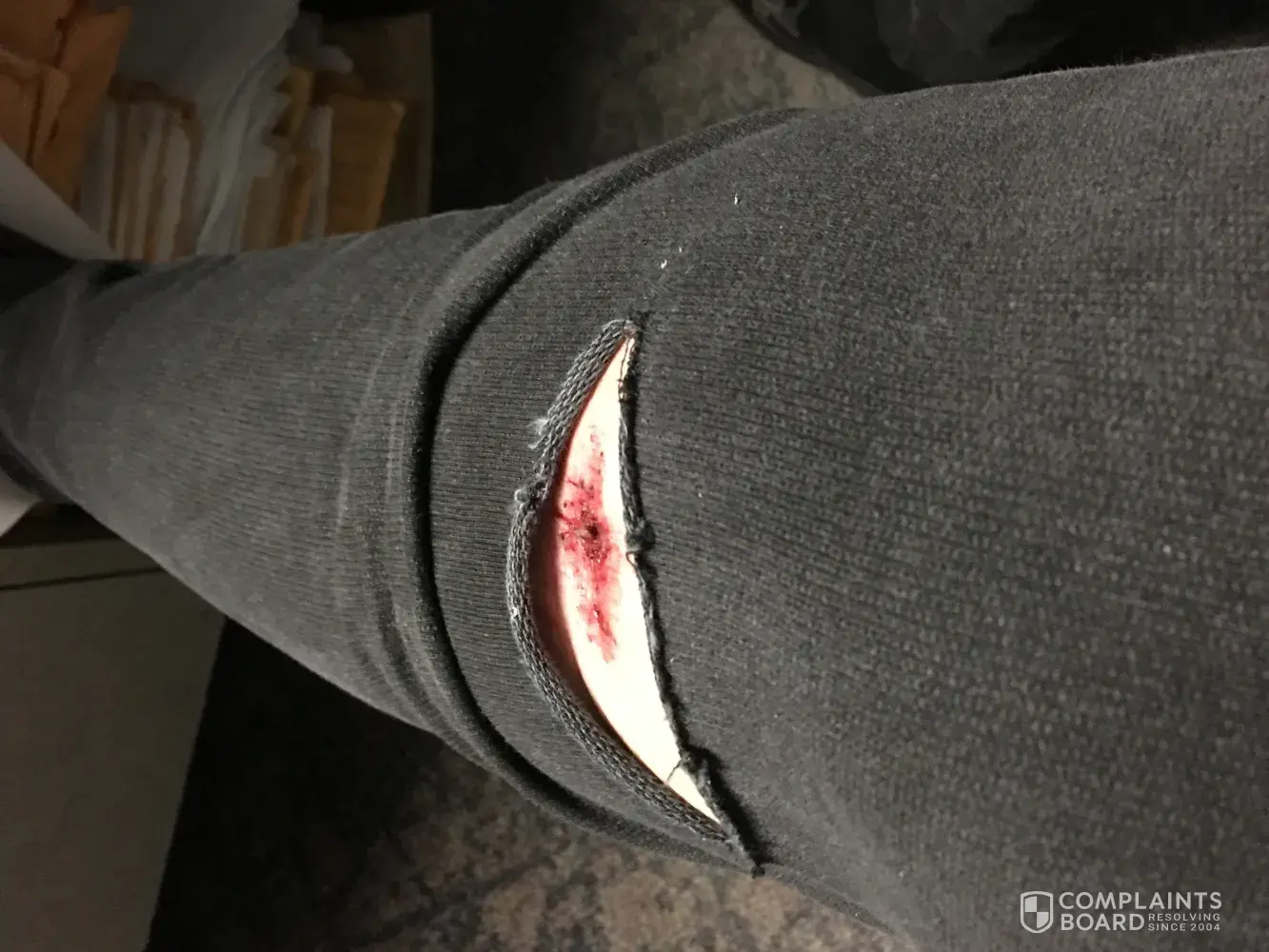 I picked up my order of bagels and was walking out front door around 6:03 am 3 May. The curb by front entrance is crumbling. There were 3 cars parked and I walked in between 2 of them. Fell flat on my face after tripping over crumbling curb. My knee is torn up, bleeding. My work pants ripped. I picked up myself and food and went to car to tend to knee. Of course its dark. I had to go to work. I cleaned up my bleeding and torn knee and sewed up my pants. I did take a photo of my knee before cleaning...I want that curb repaired before someone else falls like me. Lucky I didn't break any bones. I want someone to pay for my pants. Im 65 and don't need any more stuff like this happenening to me. I did send email to the store itself. Right now I am in pain and ANGRY over what happened. I have photo