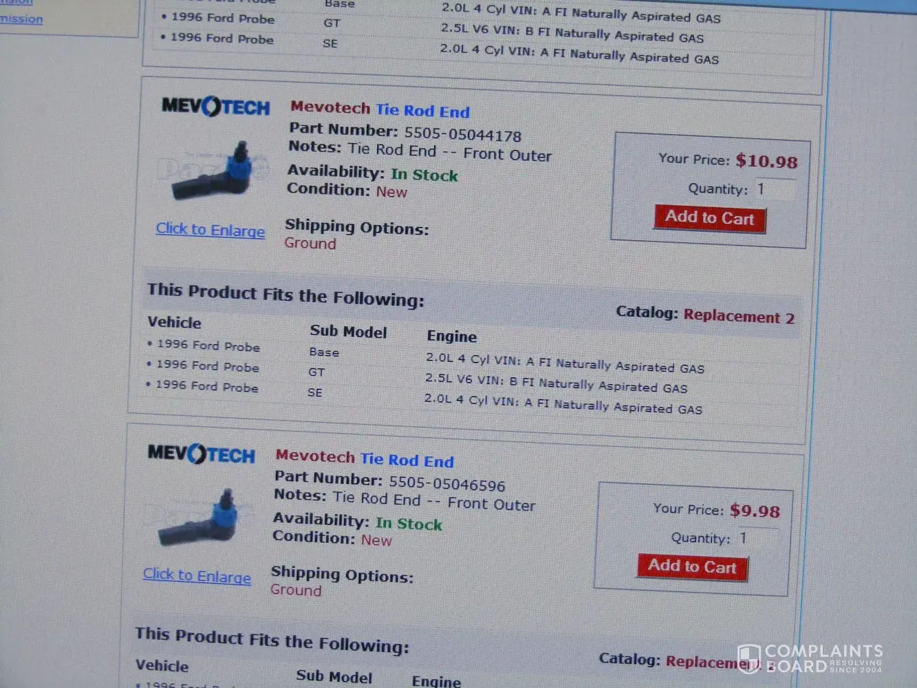 Well I have ordered from parts geek a couple of control arms for my ford probe and I have received them parts in a couple of days... This is the good part of the story... The bad part is that about a week after that I needed a couple of tie rod s ends for the same car... And on the site they have the brand that I have ordered... Same brand as the control arms... And I ordered a couple of them... And this time it took just about 2 days longer for me to receive them... Witch is not bad... The bad part is that they are another brand... Not the one that I have seen on the site... They look a lot cheaper than the brand I have ordered... But they just do not give a # about it... I sent a short e mail to the losers... And they a mailed to me back with some kind of cod so I can mail the stupid part to them at my own cost... That should not be fair at all... Because the stupid once should pay for their own mistakes... Am I wrong?... Well they do not give a # like I mentioned and I will end up driving my car with the cheap and funny looking parts... But just because they are not responsible enough to fix the problem at their own cost I will not buy from this losers again... Never ever... Because I just don t know what a heck is next... May be receive a #
