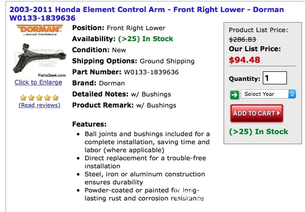 I ordered, among other things, control arms with ball joints for my Element. (They arrived 2 days after the 1st shipment on a Fri nite before my Saturday install appointment).