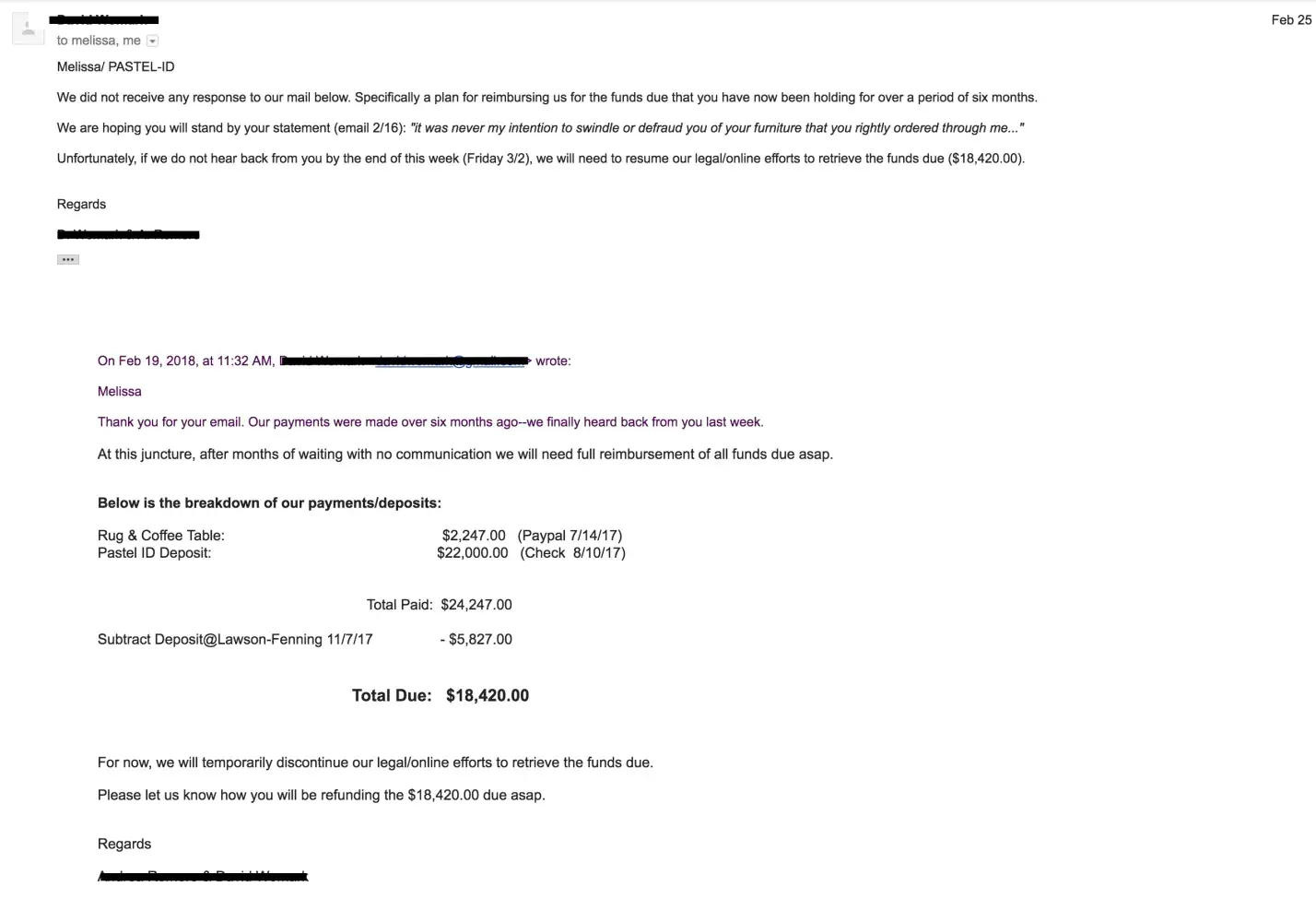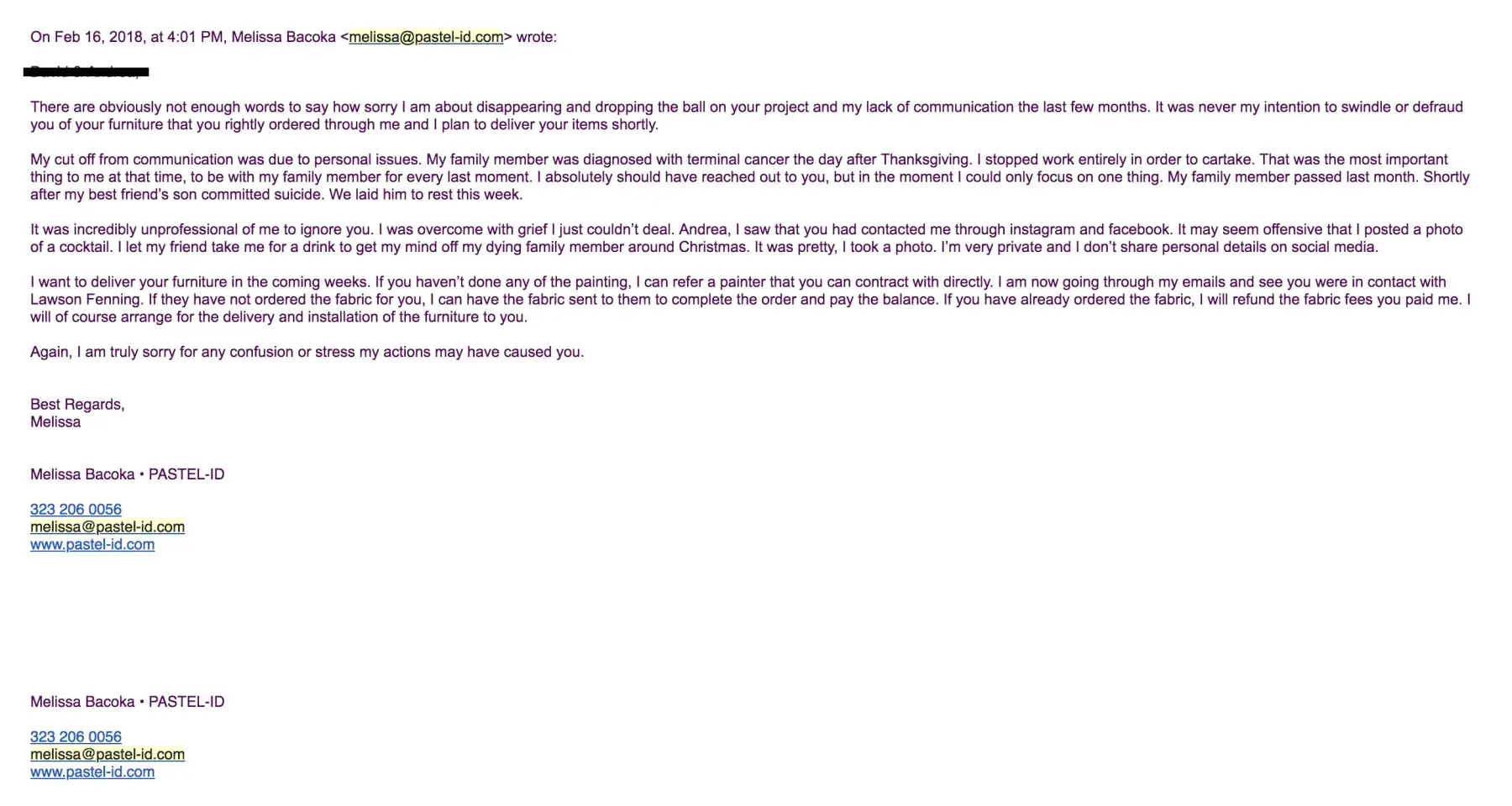 Ms Bacoka contacted us a few weeks ago - see attachments. She apologized and offered to fulfill the furniture purchases as contracted. When we asked her to simply pay us back the thousands she owes us - she disappeared again...
