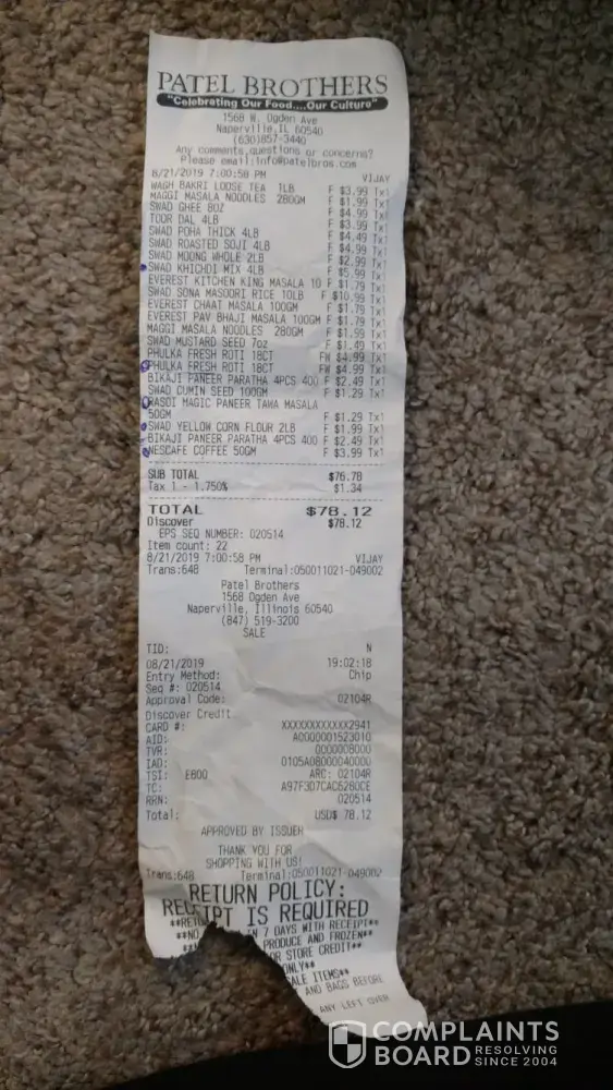 Some of the items were missing from the bill and but is added in the bill. Also the nescafe coffee is was expired and is given to us.This kind of behaviour is not acceptable and is like fooling the customers.We live near to downtown to chicago and coming to naperville just for patel brothers and we got such thing is just not acceptable