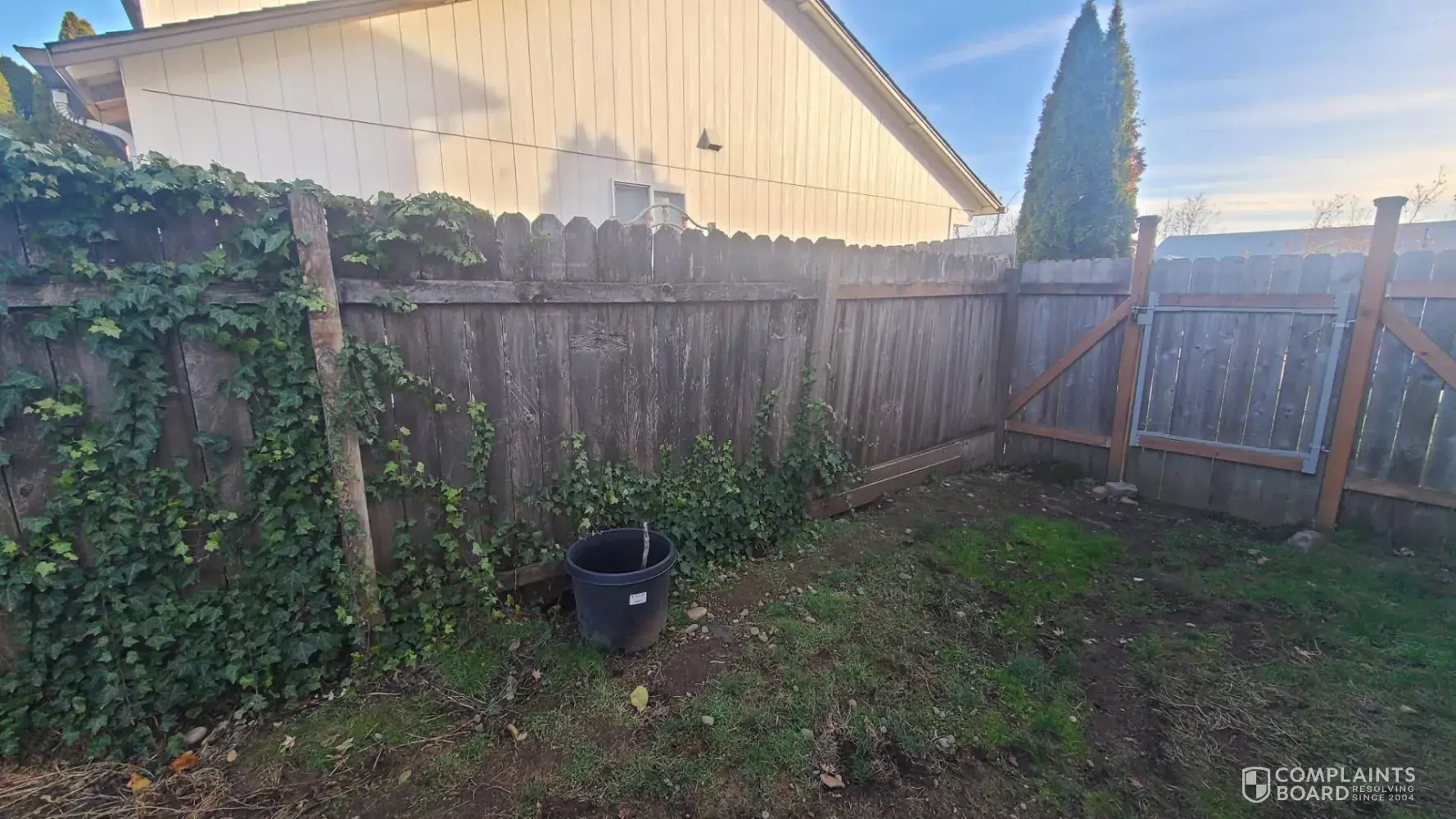 Desired outcome: They need to cut down the ivy on the fence line. Maintain the bush in the back corner that is pushing on the fence. The fence is broken due to their lack of maintenance. They and their landlord will help pay for fence repair/replacement.