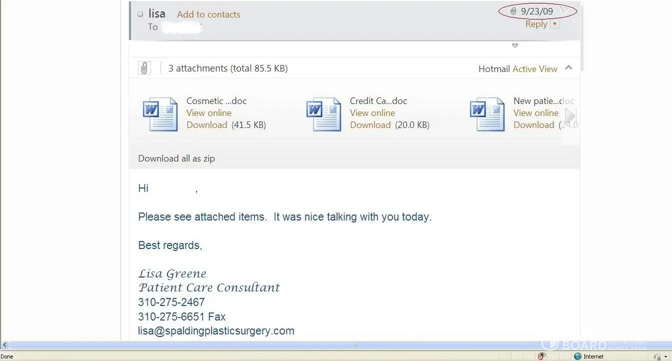 The image attached to this complaint is an email reply from Lisa Greene, Paul Nassif’s patient care consultant. The date of the email reply indicates 23 rd September 2009- and I actually received a Financial quote from Lisa Greene dated February 2011.