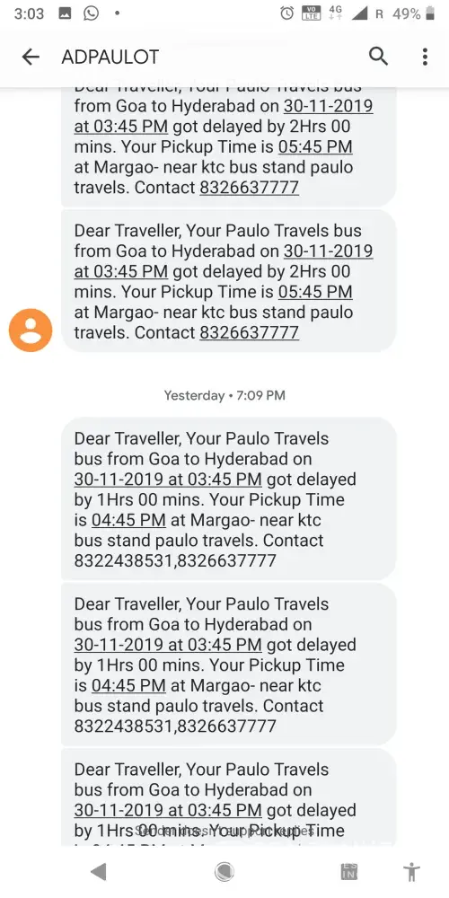 8796600601 www.paulotravels.com182951968 MUM GA M80 30-Aug Seat 9, 10 Dep 09:01 PM PickupMira road (e) - sheetal nagar, near snehanjali showroom Next Booking visit PauloTravels.com Call 8322438531. Above mentioned details. Bus took 24hrs to reach destination. Drivers are not responsive neither customer care. Drivers dont know the route. Due to this my 1 day hotel booking is wasted. Need refund and compensation.