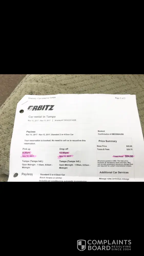 I booked with Payless car rental through the Orbitz website. My total cost with all taxes and fees included was $94.80. Ended up being charged $143.88 3 days after I returned home from my trip. They accept charges for you to acquire and are deceitful and pushy. I would be ashamed to work for this scam job. Can't even call it a business. They have done this to thousands of people all across the country. I never thought to even look at reviews, but I should have and will never rent from them again or any sistering company's. Declined all extras and insurance, returned car with full tank of gas, cleaned the inside and didn't damage the outside. No reason for an overcharge. I would like my money back! This company needs to be shut down. Have documented proof of everything and still the incorrect charge.
