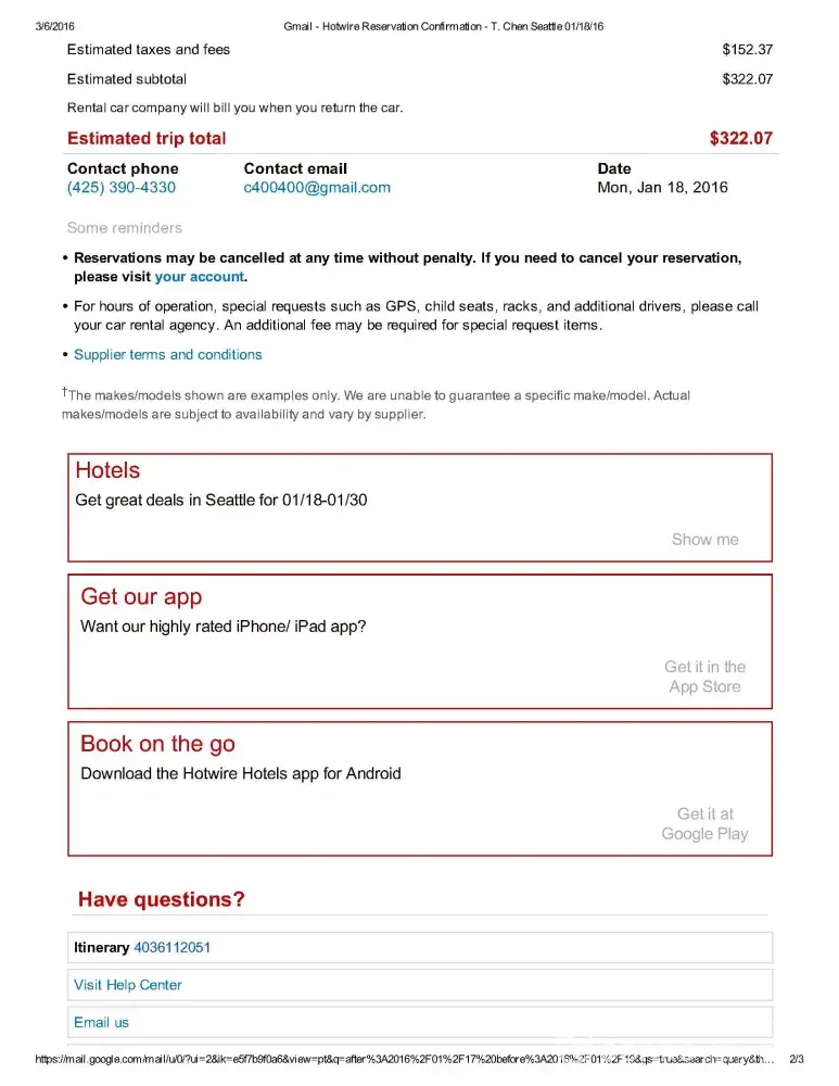 itinerary #[protected] ( pickup Jan 18 2016 drop off Jan 30 )