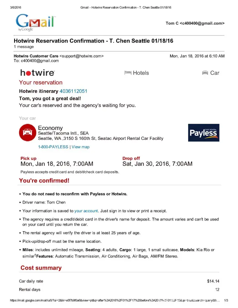 On the morning of Jan 18 2016 I booked a car rental from Payless at Hotwire for Miles: includes unlimited mileage, Seating: 4 adults, Cargo: 1 large, 1 small suitcase, Models: Kia Rio or