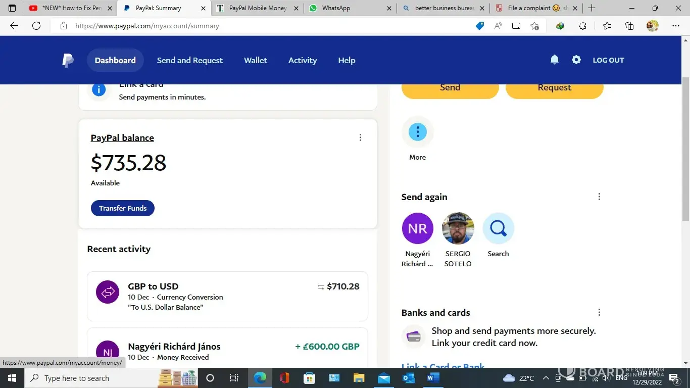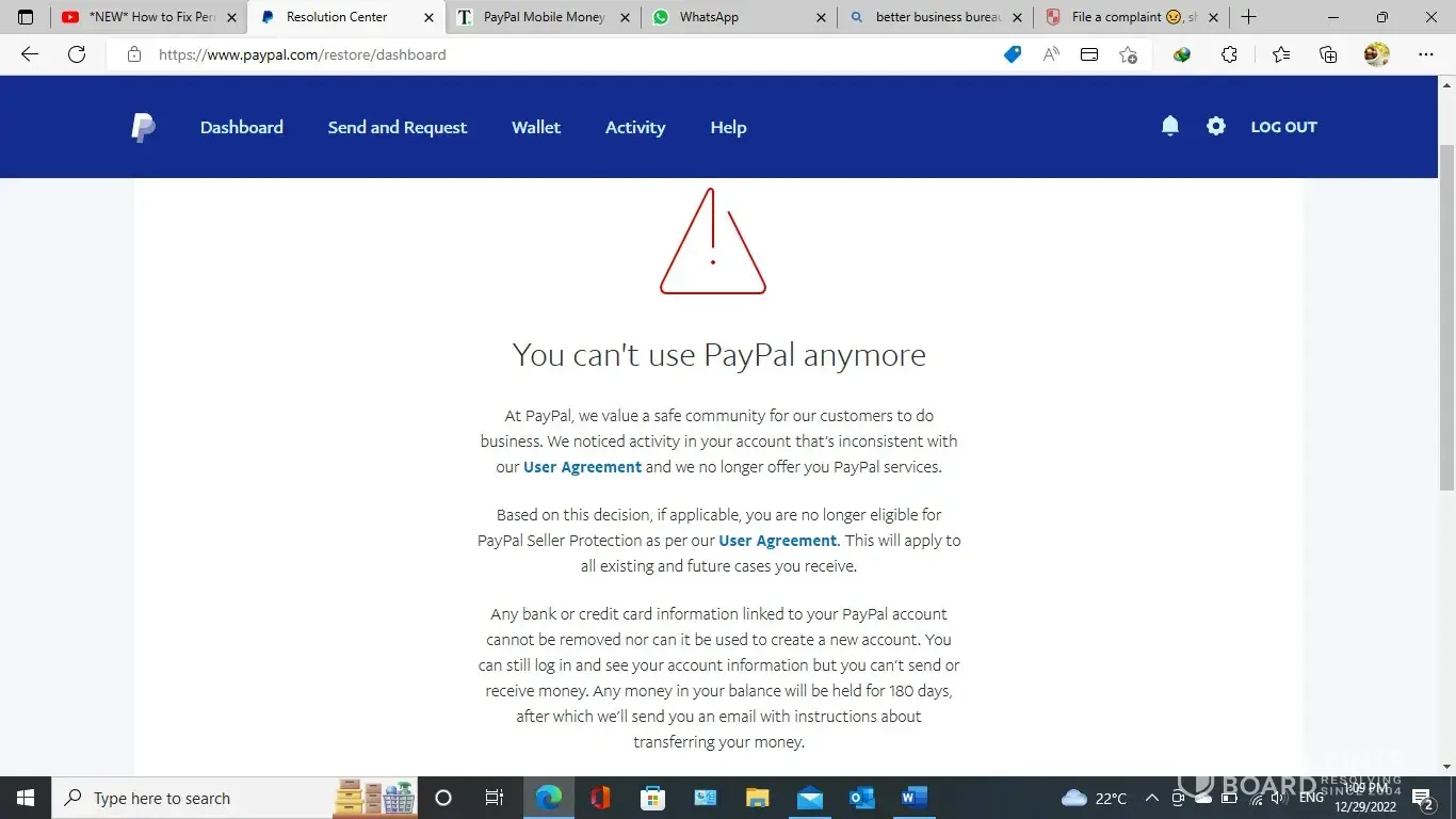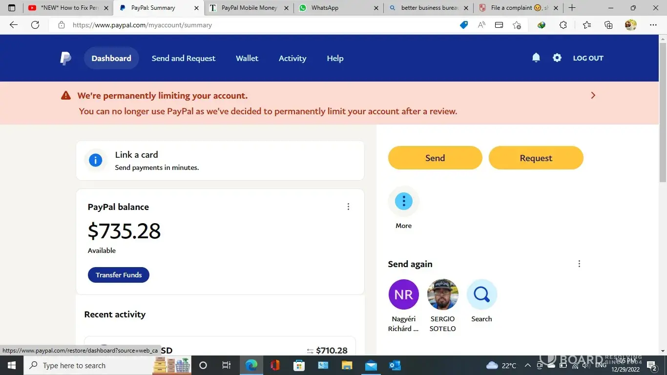 PayPal Permanent limitations of the account; account: [protected]@outlook.com with $735.28