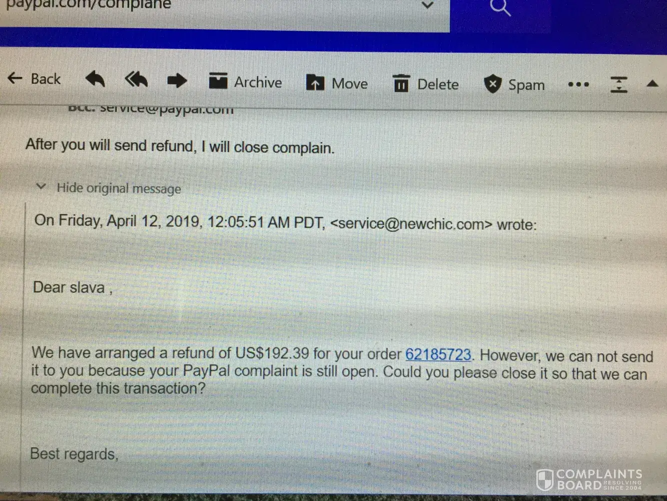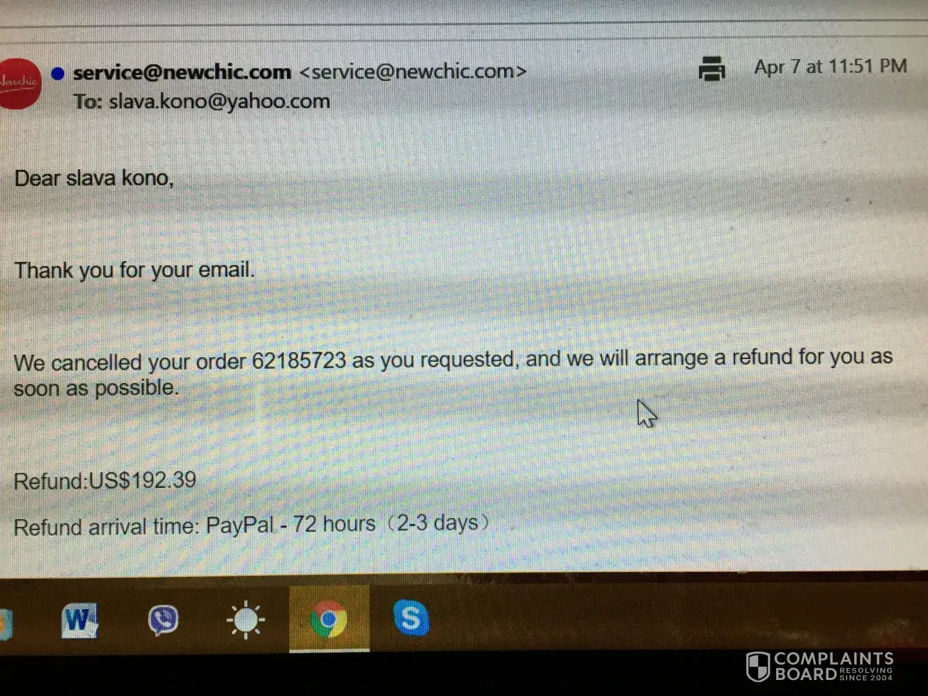 I canceled order # [protected] with newchic CO. $ 192.39 and I contact service@newchic.com many times, but from 04/07/19 they righting that I will receive money in 72 hours
