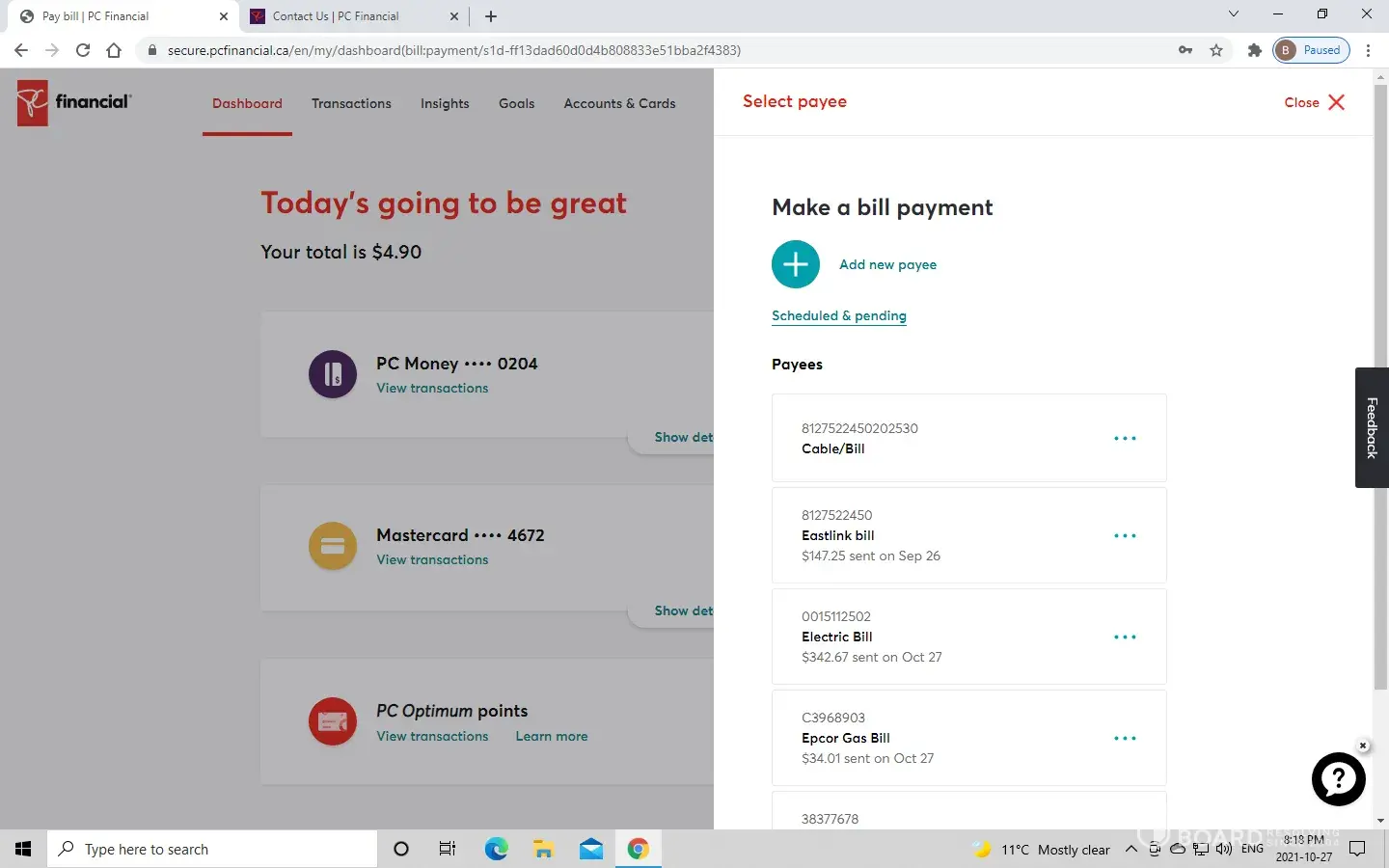 Access to pc mastercard and pc money account online
