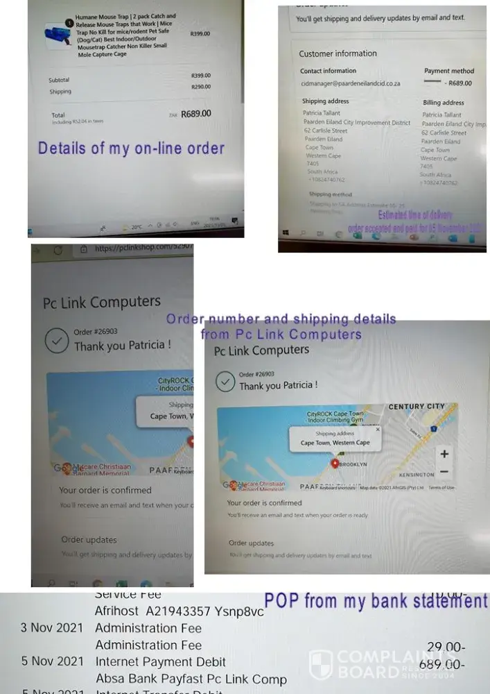 I placed an order (Order number 25848) with P C Linkshop and paid R839 for the order (delivery included) on 8 October 2021.
