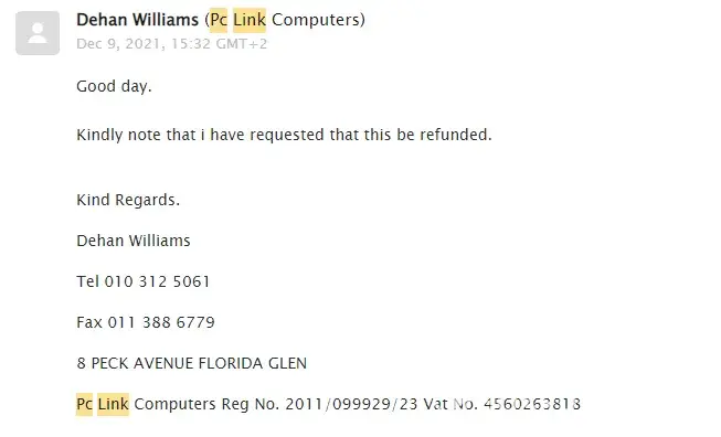 Pc Link Computers Reg No. 2011/099929/23 Vat No. [protected].. I have not received my refund to this date!