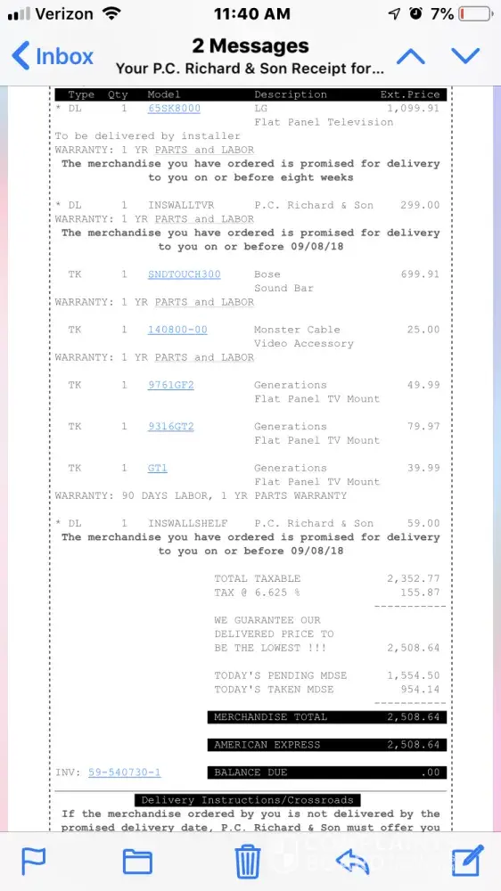 I will start by sharing that I have been a loyal Manalapan PC Richard customer for 10+ years. I recently purchased a $2500 LG refrigerator as well as a mattress, Whirpool dishwasher, cooktop, oven and microwave not to mention several TVs and small appliances.