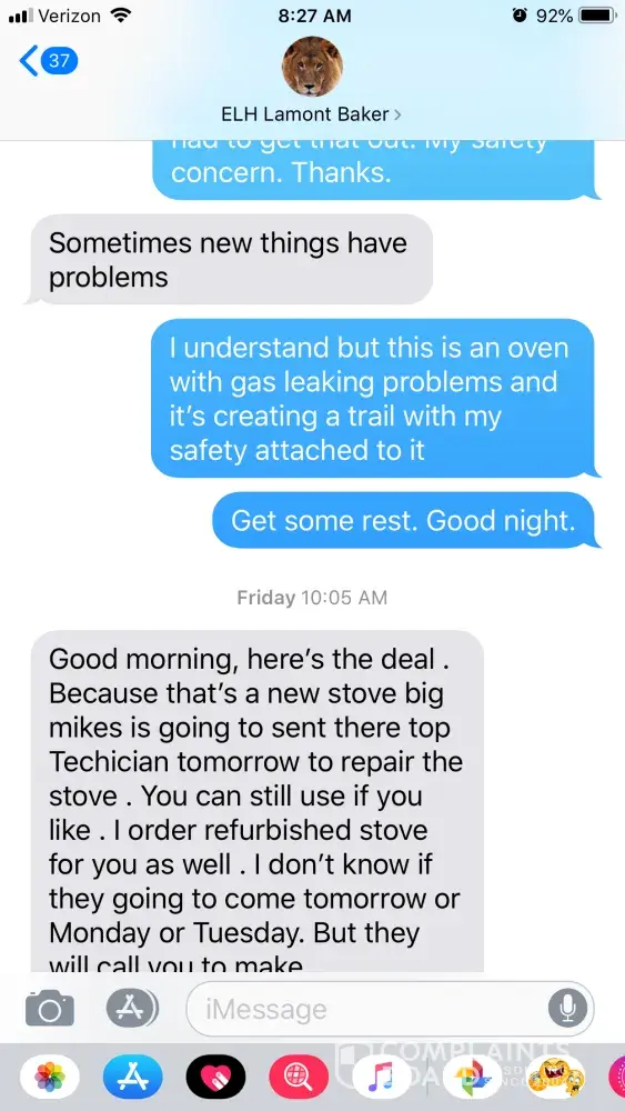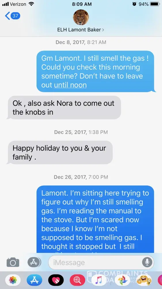 Fast forward, 1 year later, I go to turn my oven on and it won't ignite. I report it to the property manager. He sends a repair person out and they changed the ignitor and told me it burned out. When he left, I turned my oven on and after about 30 seconds, I smell overwhelming gas. I call the repair man who refuses to come back the same day, so I let property manager know this is serious and needed prompt attention, so the repair person came back the same day and took a second look and told me he would come back the next day to adjust the volume of ignitor which was the reason I was smelling gas. I took his word for it because he said he'd been doin his job for 40 years. He comes back the next day, adjusts the ignitor, but I still smelled gas when he left and moreso when I turned the oven on. Again, the property manager is made aware of this, and he schedules for the same repair persons to come back. I asked that they send someone different. They come again, and says they made the adjustment again with the ignitor and says that would fix the problem. It didn't.