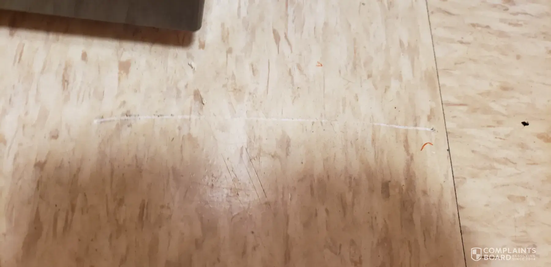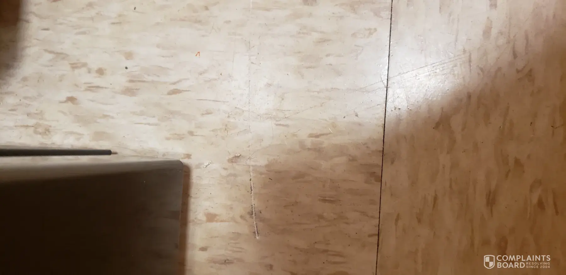damaged flooring and dented refrigerator