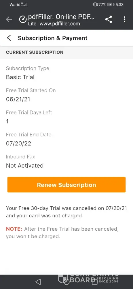 Same Complaint for me. I did not prefer for a Subscription at all. I used PDF filler to withdraw my PF. I am in trouble with family due to this. I am a volunteer doing service for people through Art of Living. Money which I need to give poor, I am forced to a situation to pay for my credit card bills. I never wanted a subscription at all. This is a very bad scenario. Automatic Subscription has happened on 2nd July. I was doing service to people at this Covid Situation... now I found it when I sat to settle my credit card bills. This is too much