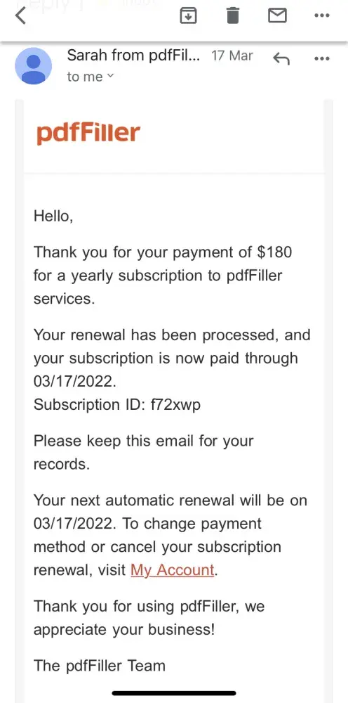 I signed up for a trial on pdfFiller and of course was notified that subscription would automatically occur if not cancelled before the trial expiration. I took special care to cancel my trial days before the deadline. Lo and behold, today I get an email thanking me for my payment of $96 for an annual subscription.