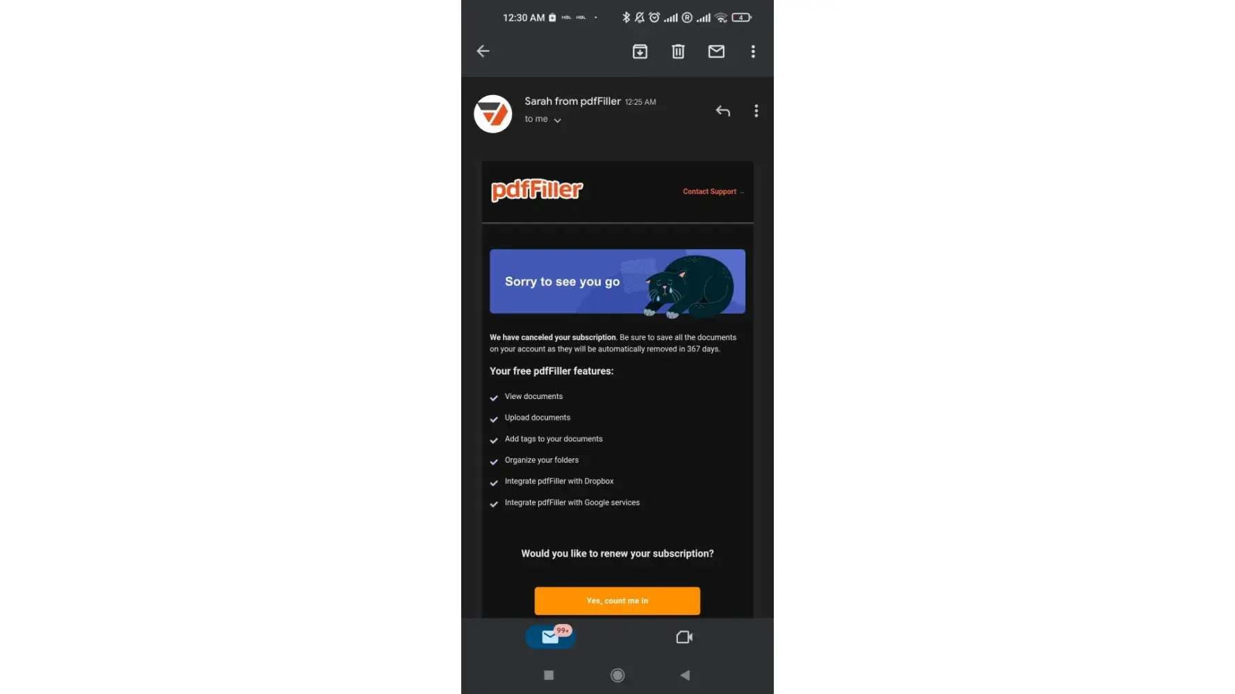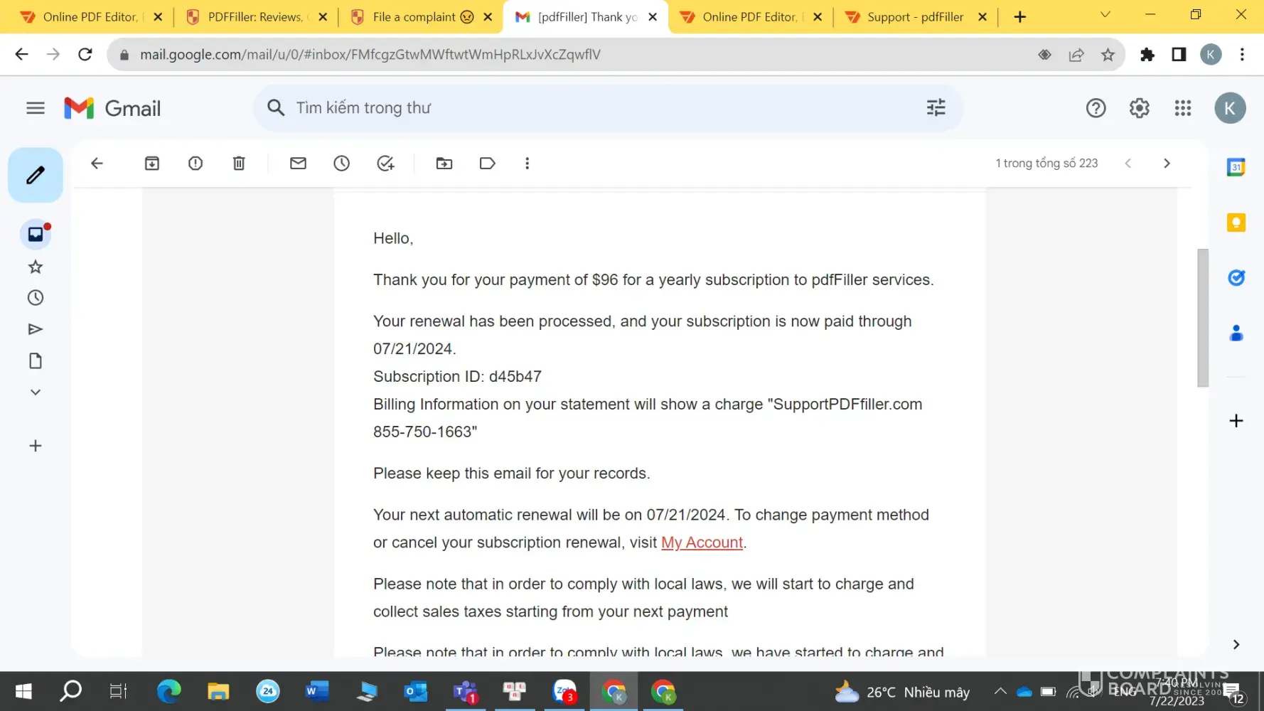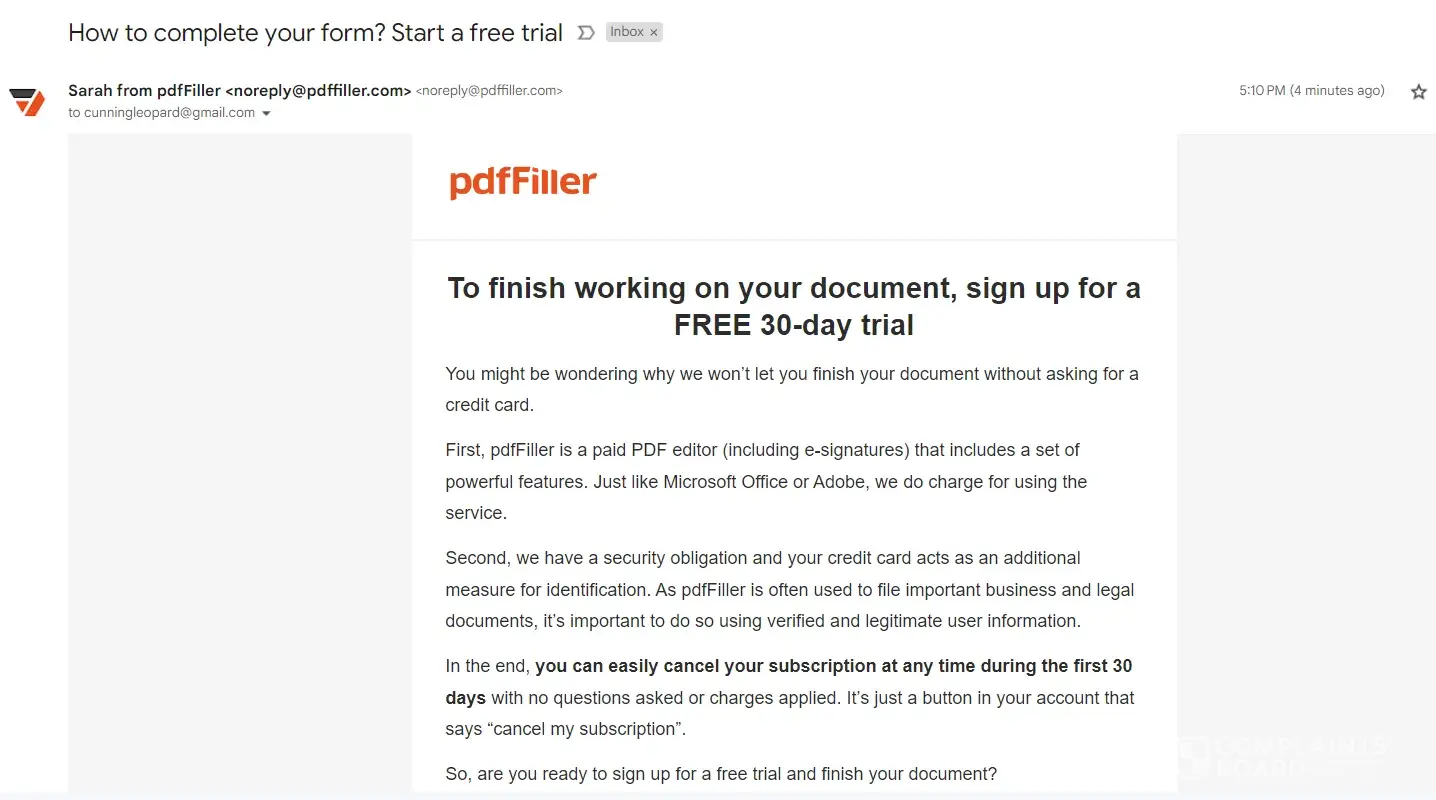 Thank you for choosing pdfFiller, April 24th, 2023 I received the following email:
