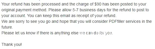 For anyone still being scammed by these thieves, if you can't get your bank to cancel any further payments, order a new bank card - it'll have a different 12-digit number (if in the UK; not sure how it works in other countries) and therefore the scammers at PDFiller will now have the wrong details. Just make sure you update your details with companies that you pay money to normally, and check your computer for viruses from PDFFiller.