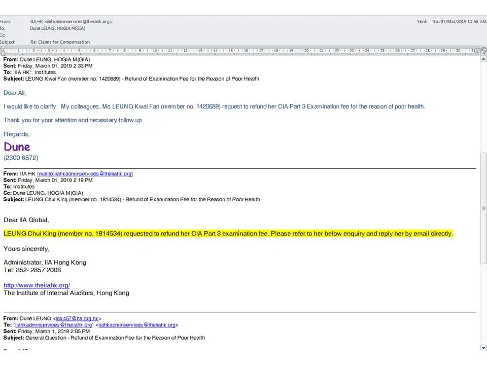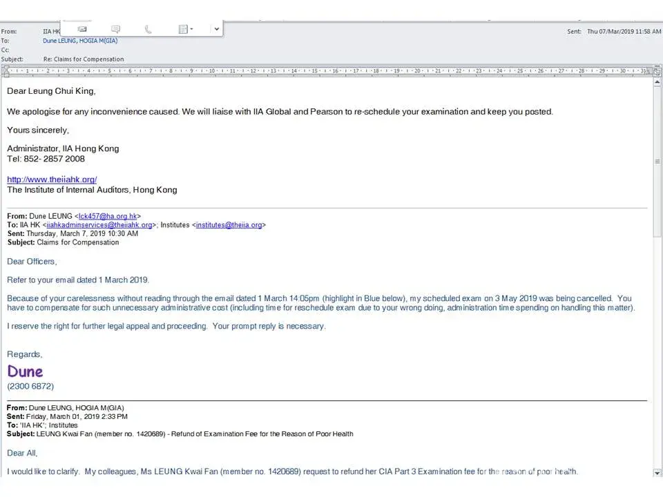 The Administrator, IIA Hong Kong admitted that they have mistaken my profile against Ms LEUNG, Kwai Fan and cancelled my exam by mistakes.