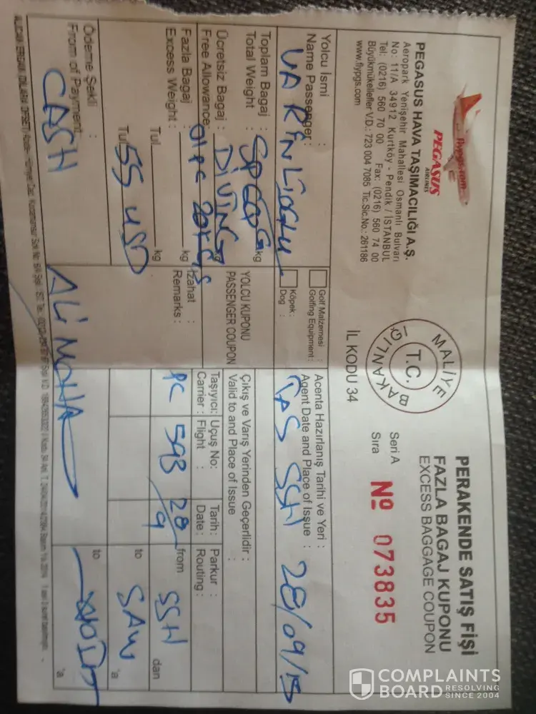 I asked to see the REGULATIONS for this payment stating that PEGASUS requires passengers to pay extra if they have diving equipment. Instead, he became more rude and threatened he would not allow me board unless I paid. I asked him to call a manager but instead he gave me an incorrect Turkish customer service number (less digits than regular Turkish numbers) a wrong number. I asked him to sign a paper, stating how much I'd been charged and for what reason, but all he offered was a receipt for 'extra luggage'.