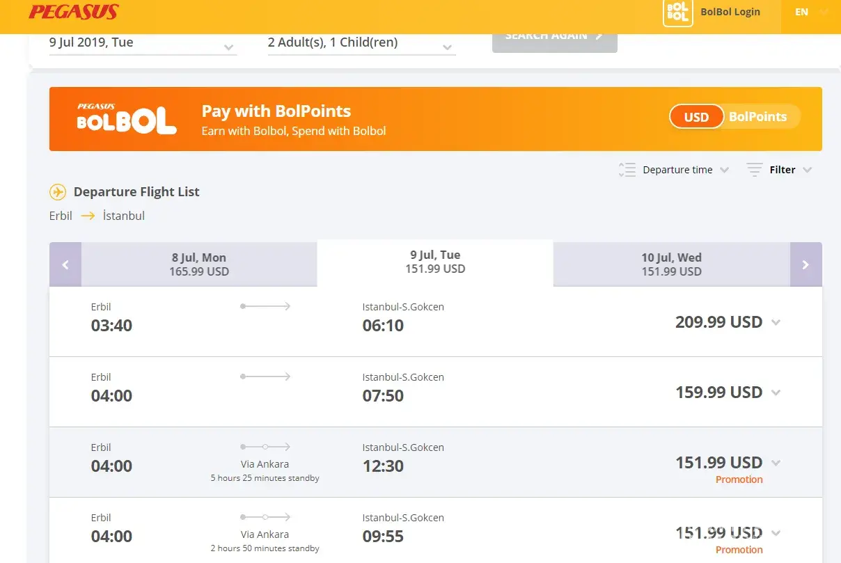 Pegasus Airlines return flight to middle east stopping in turkey