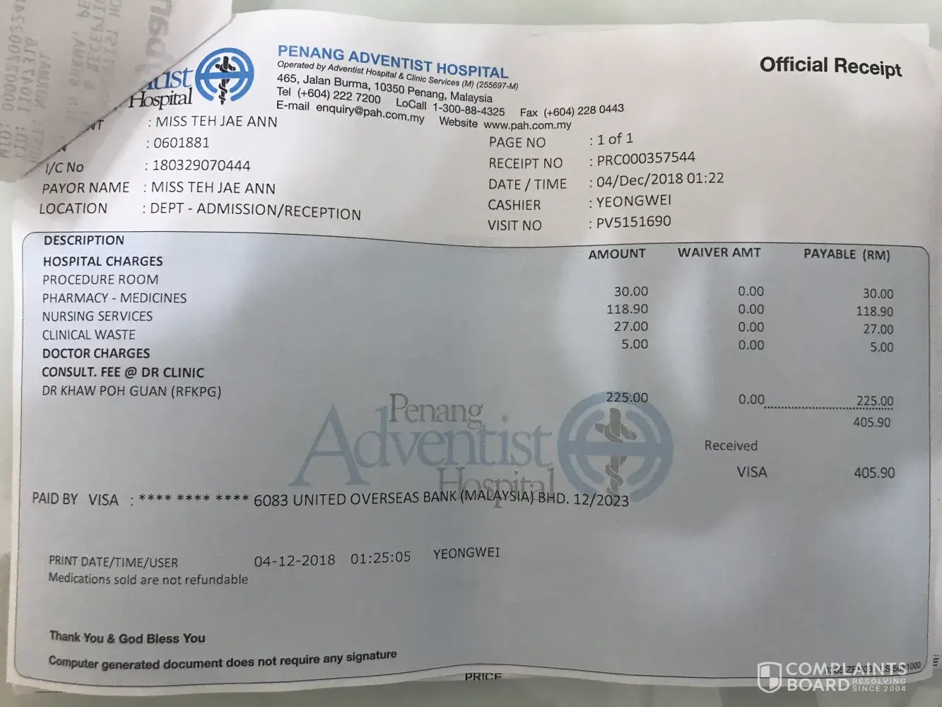 I am writing this complain to Adventist Penang Hospital. The service is very very bad.