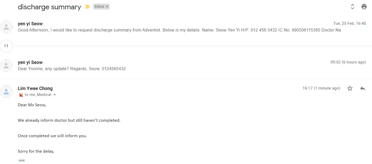 I requested discharge summary since 25Feb2020, until today 11Apr2020 still unable to receive. I called, email and the response was slow and my report is still not done after almost 2 months. My details and consent letter was provided to [protected]@pah.com.my.