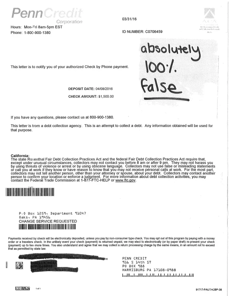 On May 9, 2016, I received a letter from Penn Credit stating that I owed $1, 500 for a deposit to my account made by "Check by Phone".