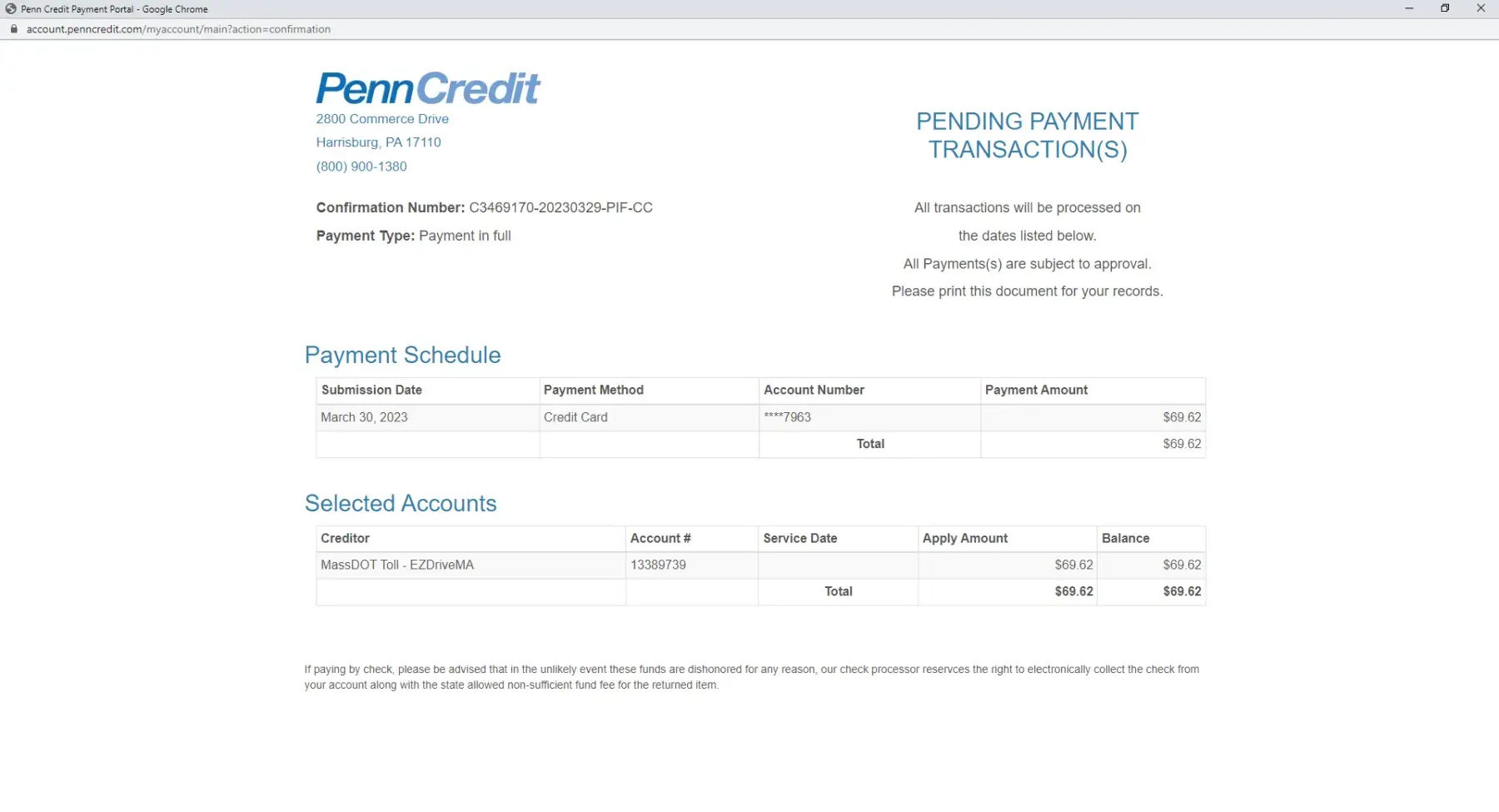 After verbal confirmation from Met Ed that my closed account was paid in full, I contacted Penn Credit to inform them of this mistake.