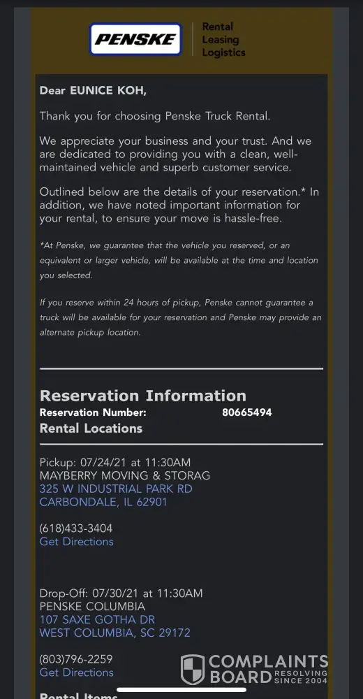 We were told the truck had to be towed, and all our household had to be transfered into another truck. This was at 11:30pm. We went on to Orangeburg, and left our 54 year old son to stay with the truck. They sent one man out with two little kids to transfer in the dark. My son, who forutnately is strong, helped the Penske rep.