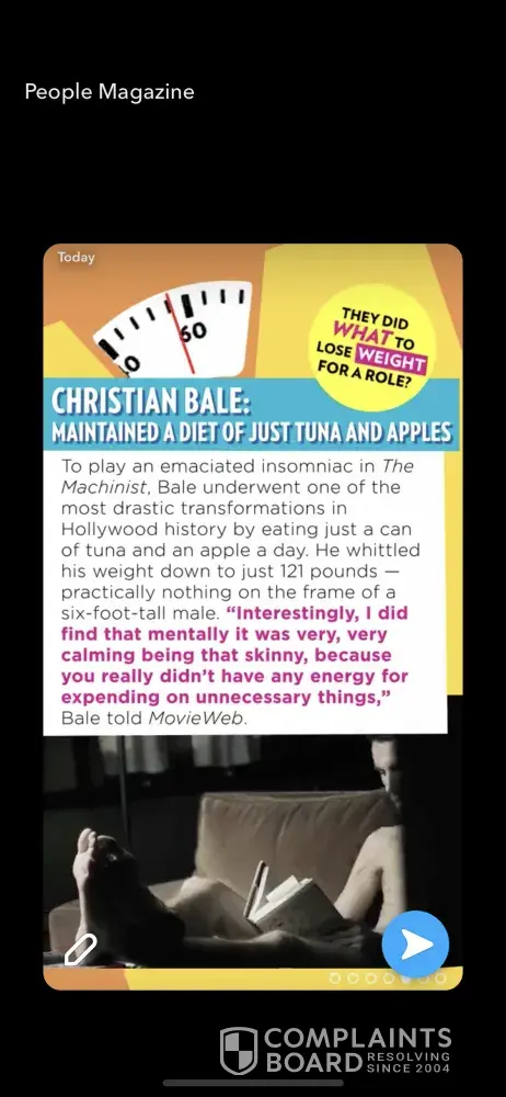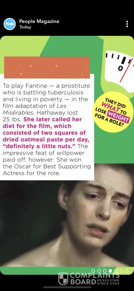 I'm really angry with your snapchat article about people who lost weight for a role, i don't understand how no one thought, wait a minute 10 million women and 1 million men have eating disorders in the US alone! So surely putting out something that condones starvation methods for good will trigger somebody to posssibly rekindle old eating behaviours or show someone who is mentally ill that celebs do it for films.