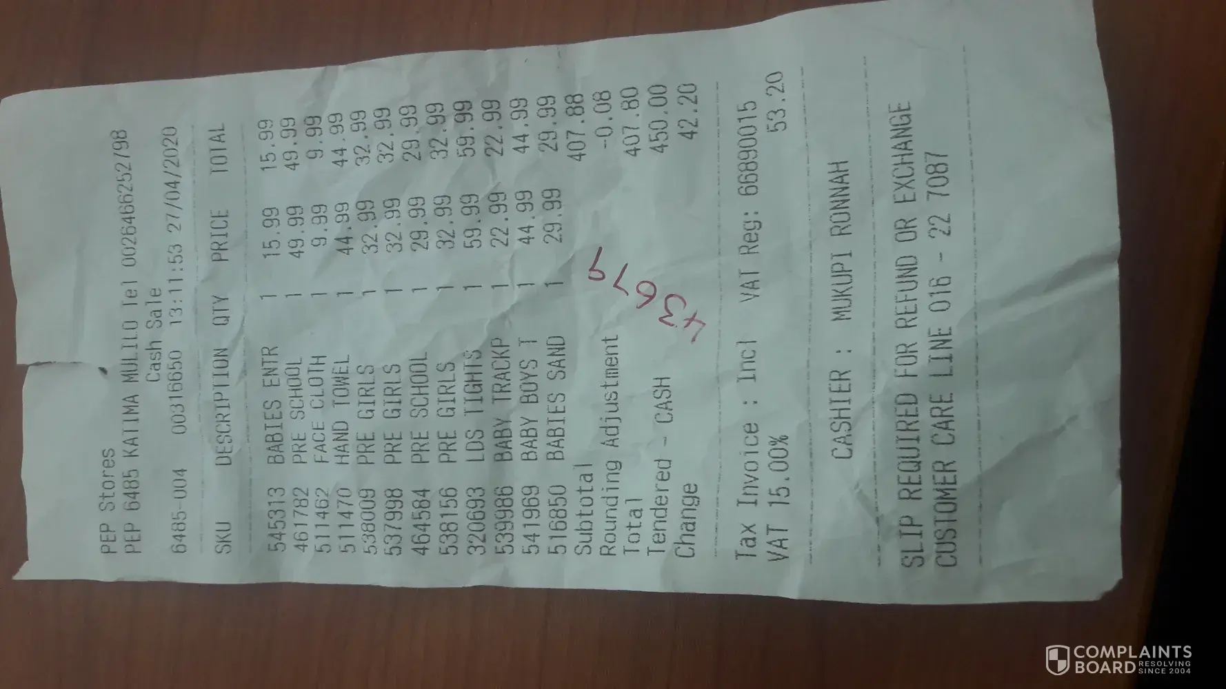 I went to pep store 6485 katima mulilo yesterday the 27 of April 2020 on till number 2 cashier was Mukupi Ronnah, her printer was not showing prices to customers, she told me ma balance was N$ 470.00 I give her N$500.00 on ma surprise when I reached home when I checked my slip I find out that my balance was N$407.00, and she just give me the charge ofN$42.20, she stole my N$50.00 just like that,, please I need intervastion.