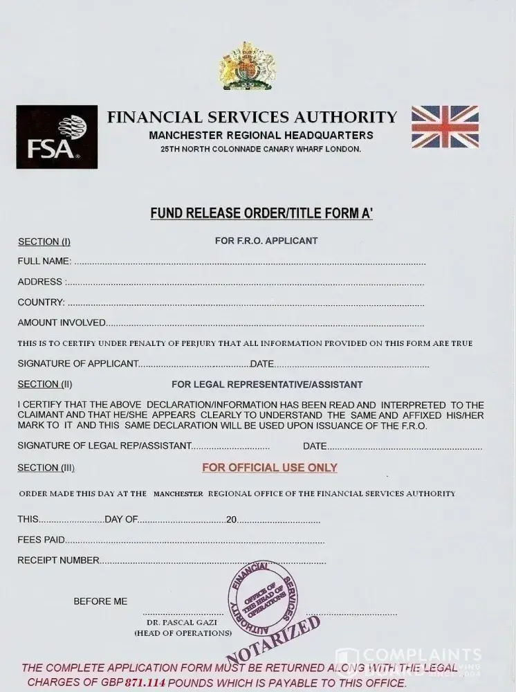 The British Financial Authority office are charging the sum of 871GBP British Pounds as a processing fee for (FRO) Fund Release Order. This payment is required in the processing office.