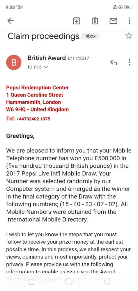 We are pleased to inform you that your Mobile Telephone number has won you £500, 000 in (five hundred thousand British pounds) in the 2017 Pepsi Live Int'l Mobile Draw. Your Number was selected randomly by our Computer system and emerged as the winner in the final category of the Draw with the following numbers; [protected]). All Mobile Numbers were obtained from the International Mobile Directory.