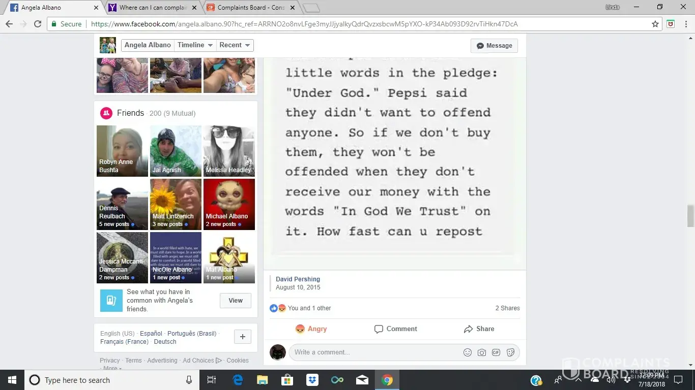July 18, 2018- I just read a post on facebook that you had a Pepsi can with the Pledge of Allegiance missing "Under God" because your Pepsi company did not want to offend anyone. As a citizen of the United States of America, I am offended. I will be extra careful from now on not to buy any Pepsi products, and to let other people know of your disrespect.